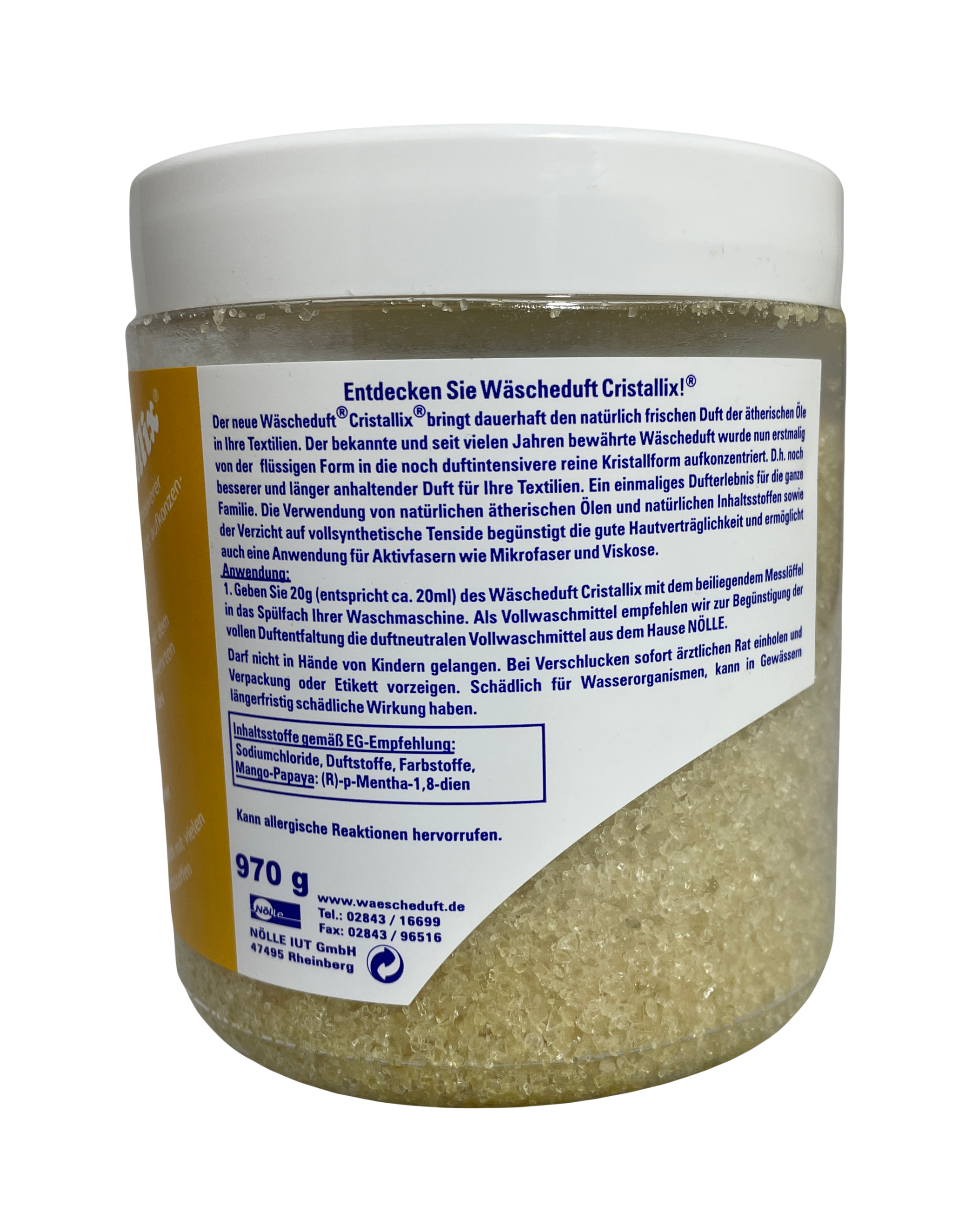 Cristallix® Wäscheduft® ist eine pflegende Duftspülung, die Ihrer Wäsche erlesene Duftnoten verleiht. Die Textilfasern werden durch die pflegenden Komponenten des Wäschebalsams gewebetief durchwirkt. Besonders gut geeignet für Mikrofaser-Textilien aber auch alle anderen Natur- und Syntetikfasern.