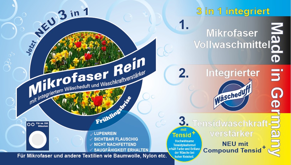 Durch das spezial Mikrofaser Vollwaschmittel bleibt die hochwirksame Mikrofaserstruktur erhalten. Das heißt, die von der Mikrofaser her bekannte Feuchtigkeitsaufnahme und Reinigungswirkung wird durch das Spezial Microfaser Vollwaschmittel in keinster Weise beeinträchtigt. Das Spezial Microfaser Vollwaschmittel ist für alle Natur- und Syntetikfasern sowie alle Microfaserartikel geeignet. Hervorragend für die Kombination mit den Düften der Wäscheduft-Serie geeignet. Geruchsneutral, erhält die Kapillarwirkung der Mikrofaser.