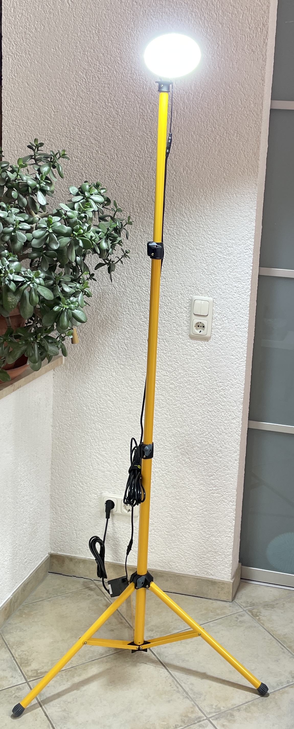 - Kommt mit einem Stahlstativ mit einer Gesamthöhe von ca. 2 Metern.
