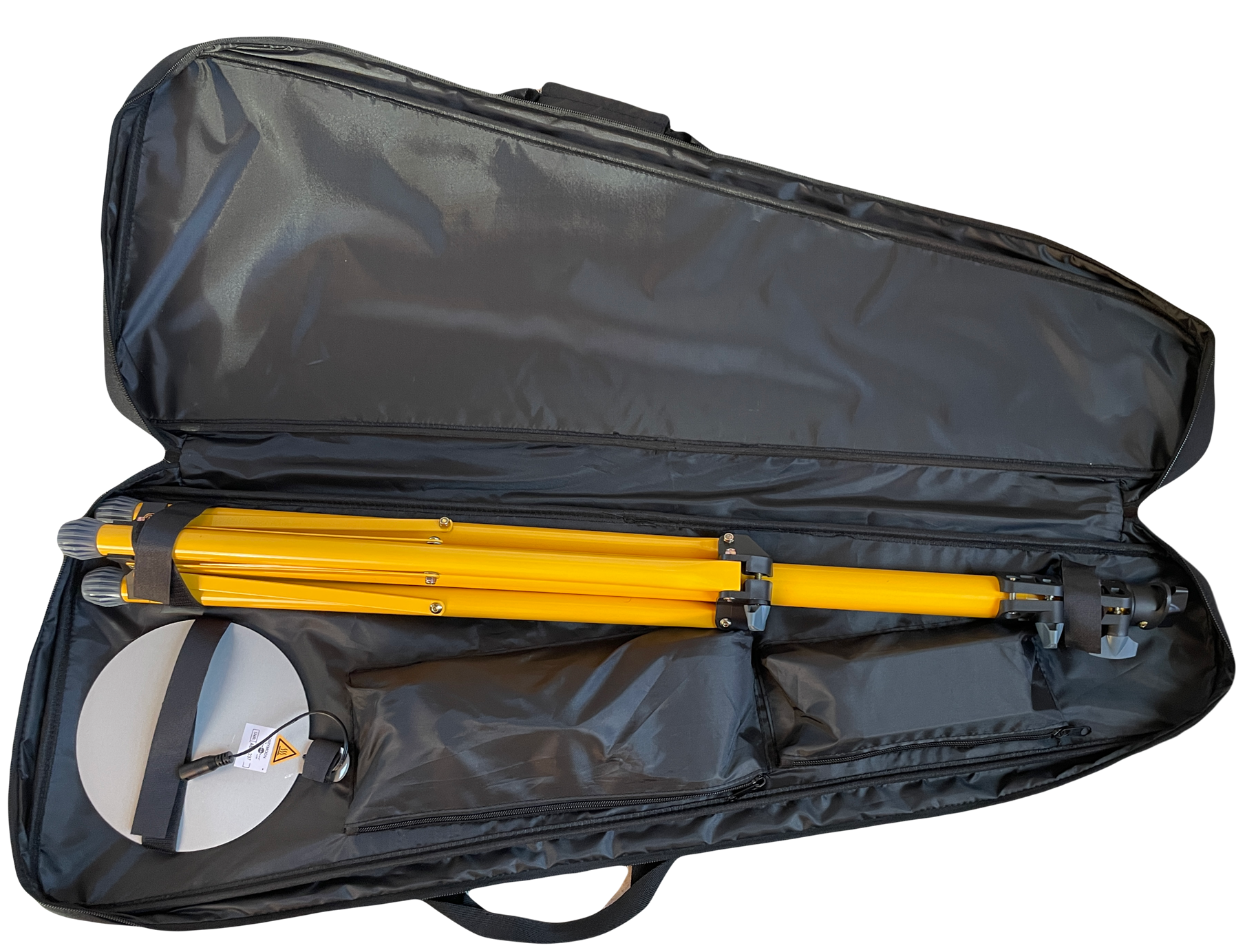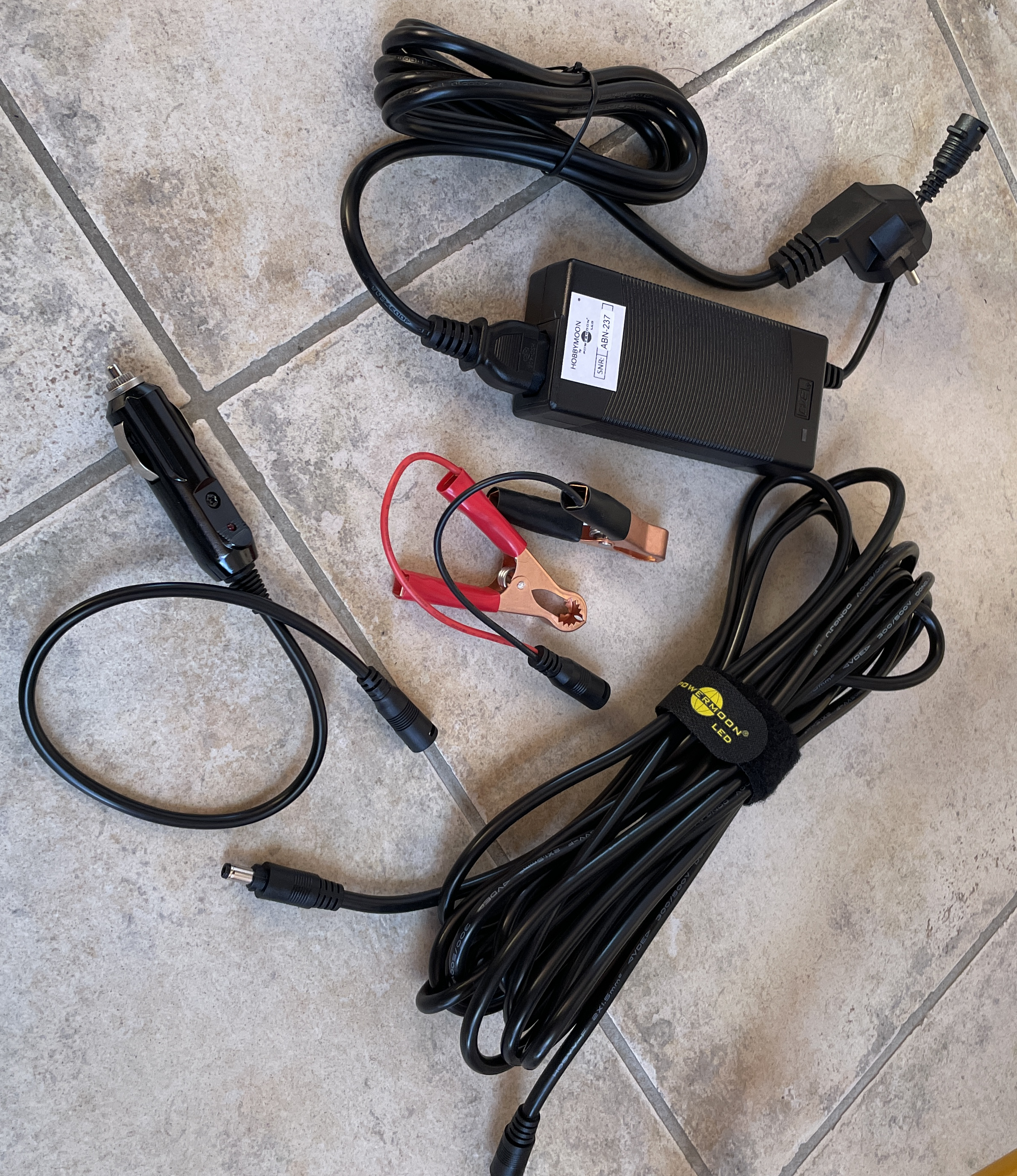 - Die Leuchte wird in einem Set mit allen Anschlüssen an AC und DC (AC / DC-Wandler, Krokodilklemmen, Autoadapter), einem Stahlstativ und einer Textiltransporttasche geliefert.